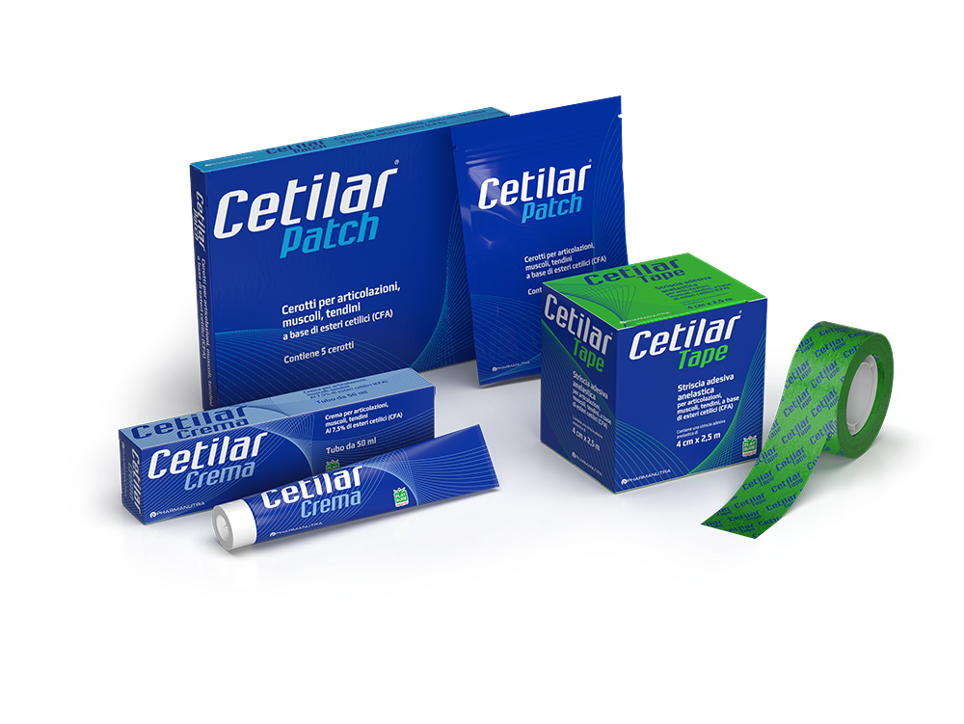 Cetilar® brand consists of 3 products for topical use (Cream, Patch and Tape) and 1 for oral administration. In fact, after 8 years of research, a mixture of CFAs has been authorized as Novel Food. This new ingredient, which takes the name of Lipocet®, consists mainly of a mixture of myristic acid, oleic acid and, to a lesser extent, other cetylated fatty acids.5